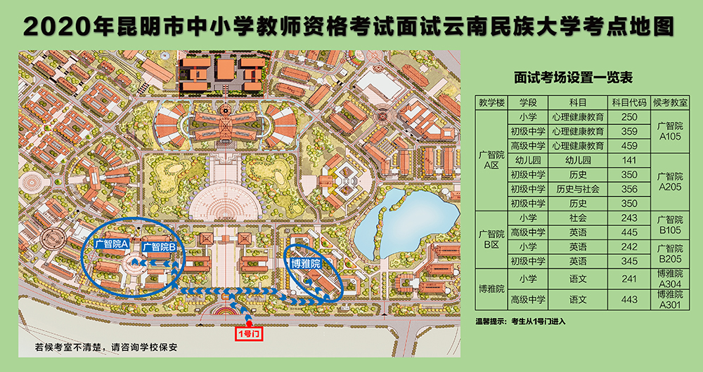 按照《云南省2020年下半年中小學(xué)教師資格考試(面試)公告》和《昆明市2020年下半年中小學(xué)教師資格考試(面試)疫情防控要求公告》,結(jié)合目前疫情防控新形勢要求,為廣大考生能順利參加面試,現(xiàn)將考點(diǎn)示意圖、候考室分布及疫情防控補(bǔ)充事項公告如下: