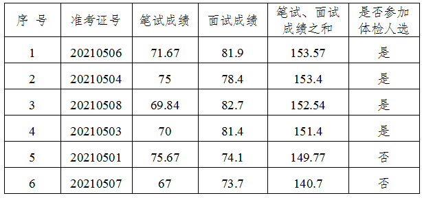 根據(jù)筆試、面試成績之和從高到低的順序,按1:2的比例確定參加體檢人選。筆試面試成績及參加體檢人選名單如下: