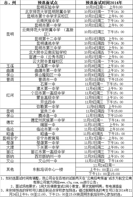 2015年東航云南公司招收飛行學(xué)生預(yù)選初檢日程