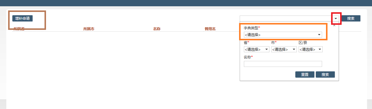 3.增補(bǔ)衛(wèi)生單位時(shí)請直接點(diǎn)擊左上方的“增補(bǔ)申請”進(jìn)入衛(wèi)生單位增補(bǔ)界面,如果增補(bǔ)學(xué)校請?jiān)谟疑戏剿阉貦趦?nèi)將字典類型選項(xiàng)選擇成“院校”后再點(diǎn)擊左上方“增補(bǔ)申請”進(jìn)入增補(bǔ)界面;
