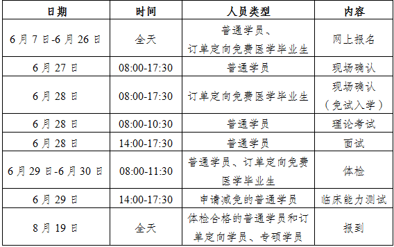 1.普通學(xué)員、訂單定向免費(fèi)醫(yī)學(xué)畢業(yè)生體檢時(shí)間:2022年6月29日-6月30日