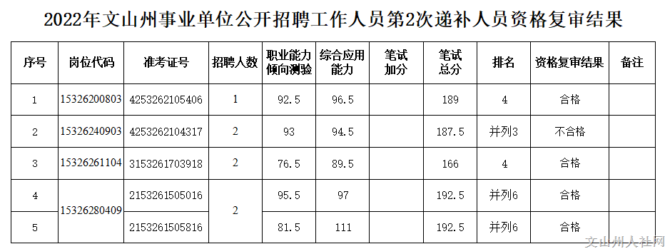 2022年文山州事業(yè)單位招聘第2次遞補資格復審結(jié)果公示