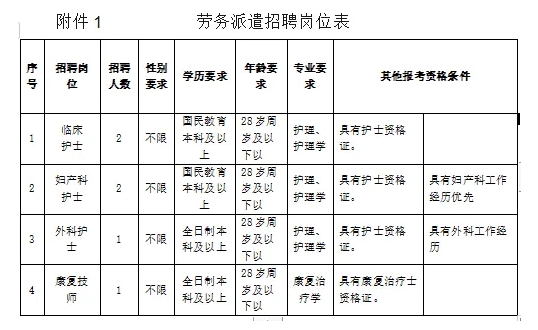 公開(kāi)招聘勞務(wù)派遣類(lèi)醫(yī)療護(hù)理工作人員,崗位要求詳見(jiàn)《勞務(wù)派遣招聘崗位表》。