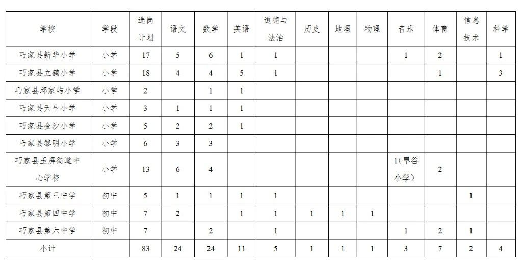 此次公開(kāi)選崗崗位83個(gè),各學(xué)段各學(xué)科崗位計(jì)劃如下: