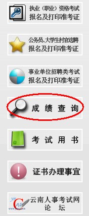 登錄報(bào)名網(wǎng)站云南人事考試網(wǎng),網(wǎng)址為:www.ynrsksw.cn、www.ynrsksw.net或www.ynrsksw.com(登錄任意一個(gè)網(wǎng)址均可查詢)。如下圖所示,在首頁(yè)的右側(cè)點(diǎn)擊“成績(jī)查詢”,選擇2013年公務(wù)員考試,在“登記類別”欄選擇“當(dāng)年成績(jī)查詢”,輸入“考生姓名”及“身份證號(hào)”,即可查詢本人各科的詳細(xì)成績(jī)。