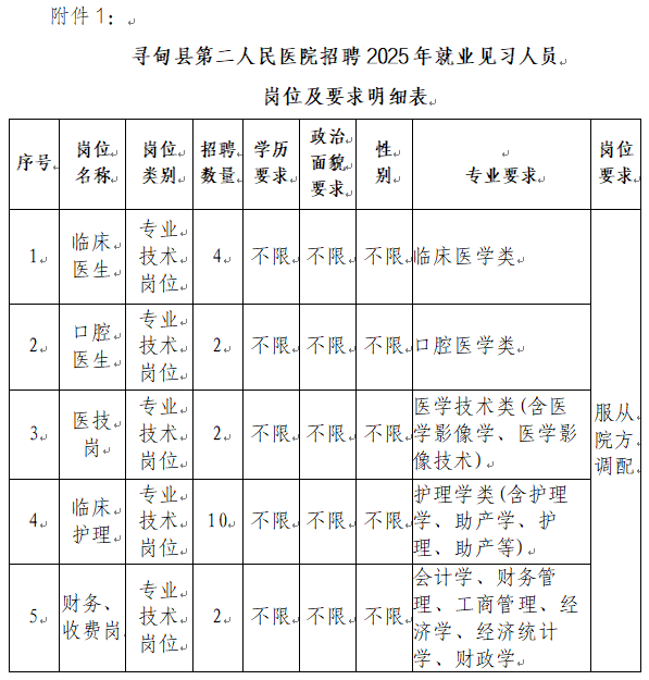 具體崗位要求詳見附件1《尋甸縣第二人民醫(yī)院2025年公開招聘就業(yè)見習(xí)人員計劃明細(xì)表》