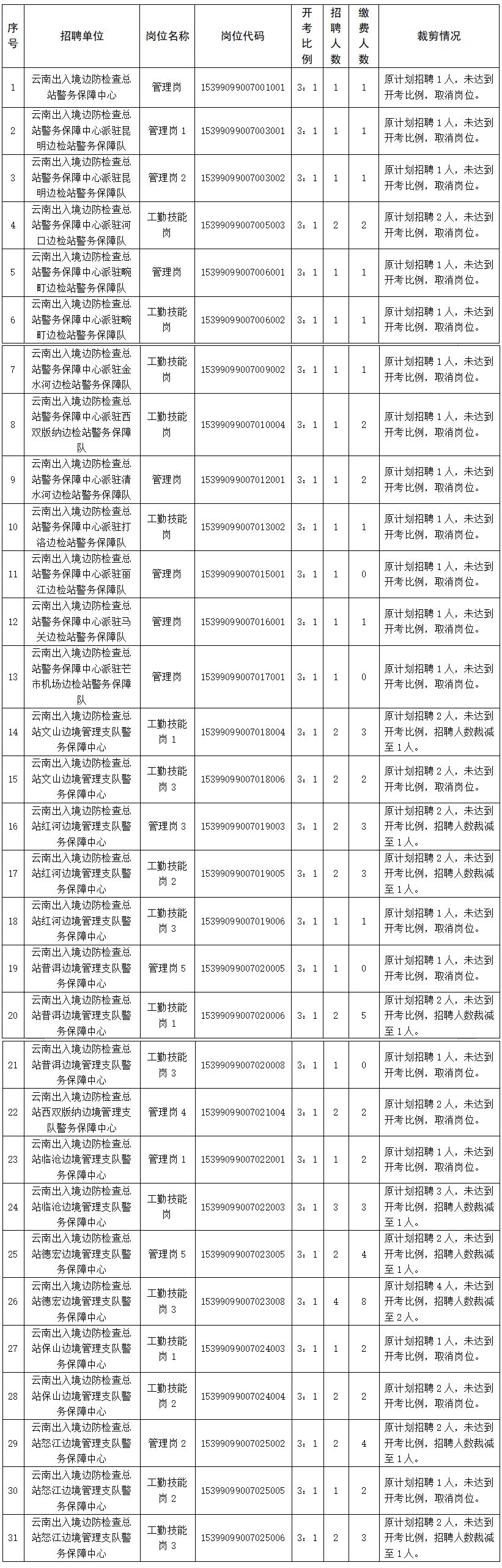 根據(jù)《2025年云南出入境邊防檢查總站所屬事業(yè)單位公開招聘人員公告》“每個崗位的繳費(fèi)人數(shù)與計(jì)劃招聘人數(shù)不低于3:1方能開考。未達(dá)到3:1的,根據(jù)繳費(fèi)人數(shù)予以裁減或取消。”的要求,結(jié)合網(wǎng)上報(bào)名、資格審查、繳費(fèi)等情況,現(xiàn)將崗位裁減情況公告如下:
