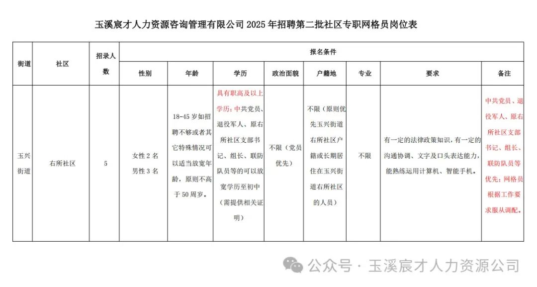 因工作需要,玉溪宸才人力資源咨詢管理有限公司面向社會(huì)招聘2025年第二批社區(qū)專職網(wǎng)格員,現(xiàn)將有關(guān)事宜公告如下: