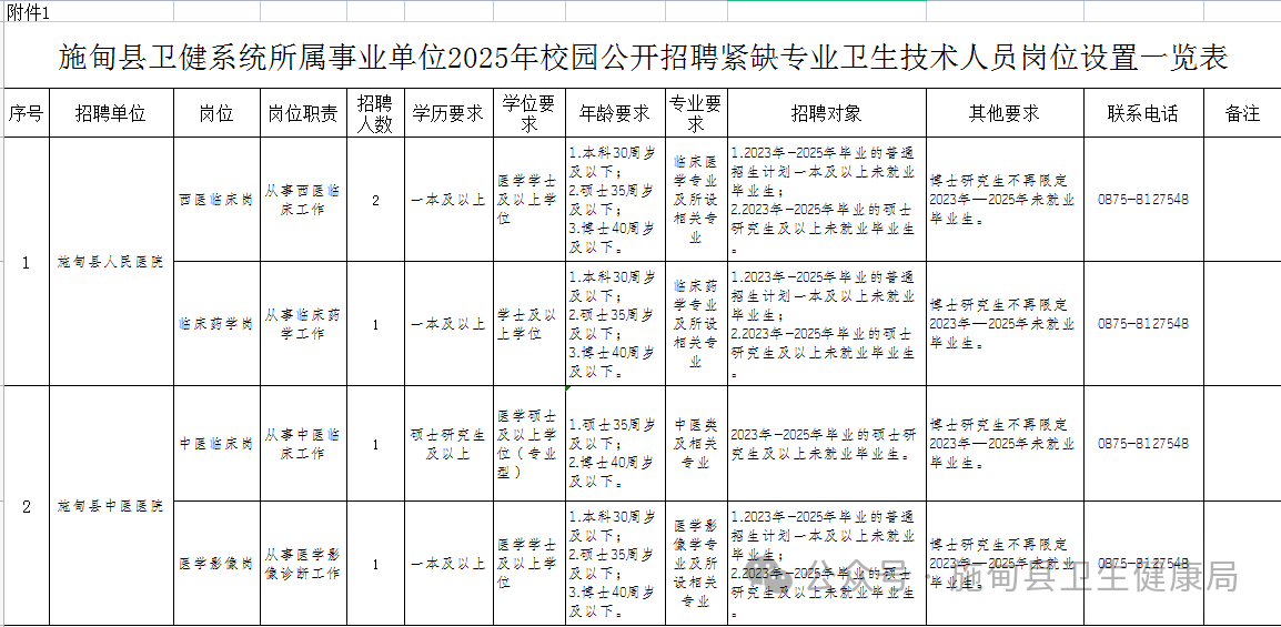 附件:1.《施甸縣衛(wèi)健系統(tǒng)所屬事業(yè)單位2025年校園公開(kāi)招聘緊缺專業(yè)衛(wèi)生技術(shù)人員崗位設(shè)置一覽表》