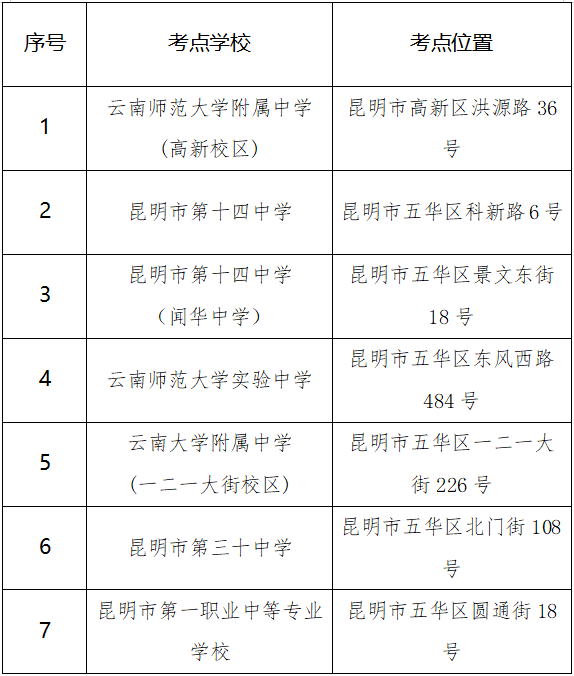 五華區(qū)共設(shè)7個(gè)考點(diǎn)。考生可根據(jù)準(zhǔn)考證信息確認(rèn)自己的考點(diǎn),避免找錯(cuò)考點(diǎn)、進(jìn)錯(cuò)考場(chǎng)。考點(diǎn)具體地址如下: