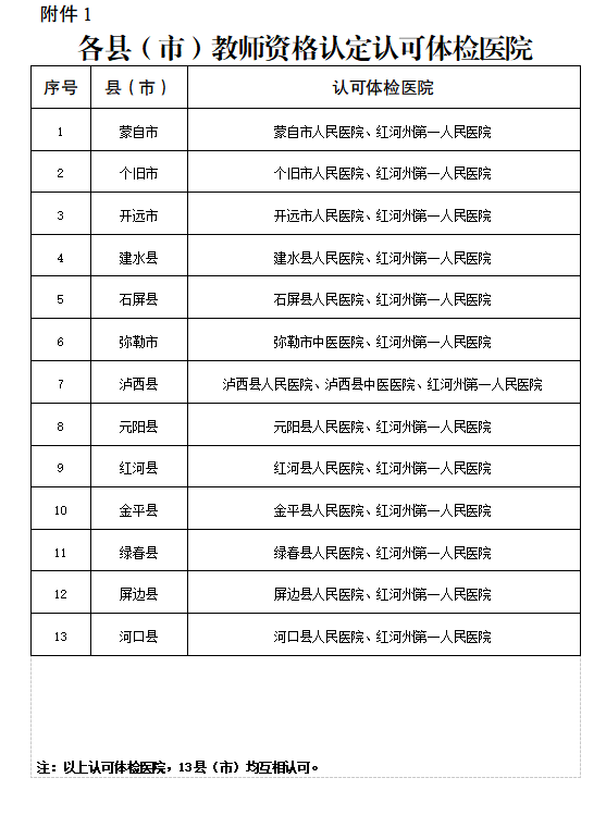 (7)《云南省申請教師資格認(rèn)定人員體檢表》原件(見附件1)。經(jīng)紅河州轄區(qū)內(nèi)縣級以上公立醫(yī)院(具體認(rèn)可醫(yī)院詳見附件2)體檢結(jié)論簽署“合格”且有體檢醫(yī)院意見并加蓋公章的體檢表原件,體檢報告僅限當(dāng)次認(rèn)定有效。