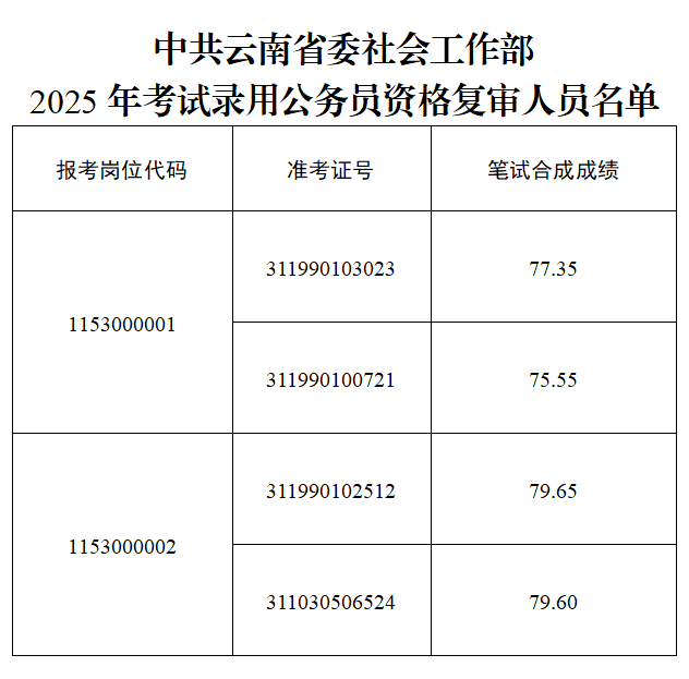 從報考中共云南省委社會工作部2025年考試錄用公務員崗位筆試成績達到云南省2025年度考試錄用公務員筆試最低合格分數(shù)線以上的考生中,按不超過錄用計劃數(shù)2倍的比例和筆試成績由高到低的順序確定資格復審人員,詳見《中共云南省委社會工作部2025年考試錄用公務員資格復審人員名單》。