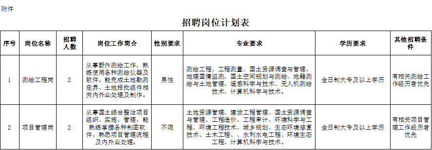 本次招聘工作人員分為測繪工程、項目管理2個崗位共計4人(詳見附件招聘崗位計劃表)。