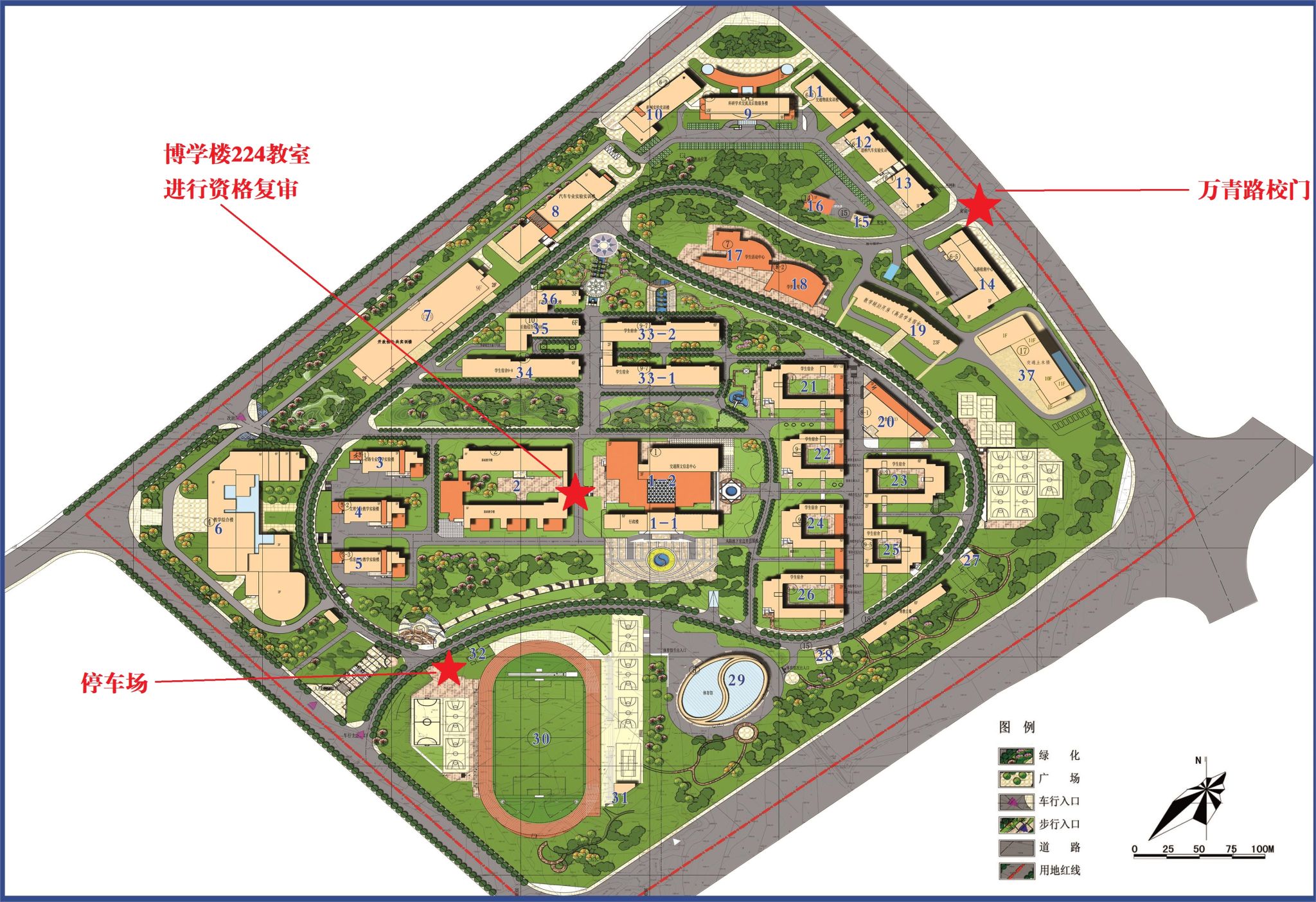 因?qū)W校停車位十分緊張,參加資格復(fù)審的考生請盡量乘坐公共交通,從萬青路校門入校。確實需要開車入校的,請聽從學(xué)校安保人員指揮,登記車牌及聯(lián)系方式,在指定地點內(nèi)停車,停車地點及資格復(fù)審地點見圖示: