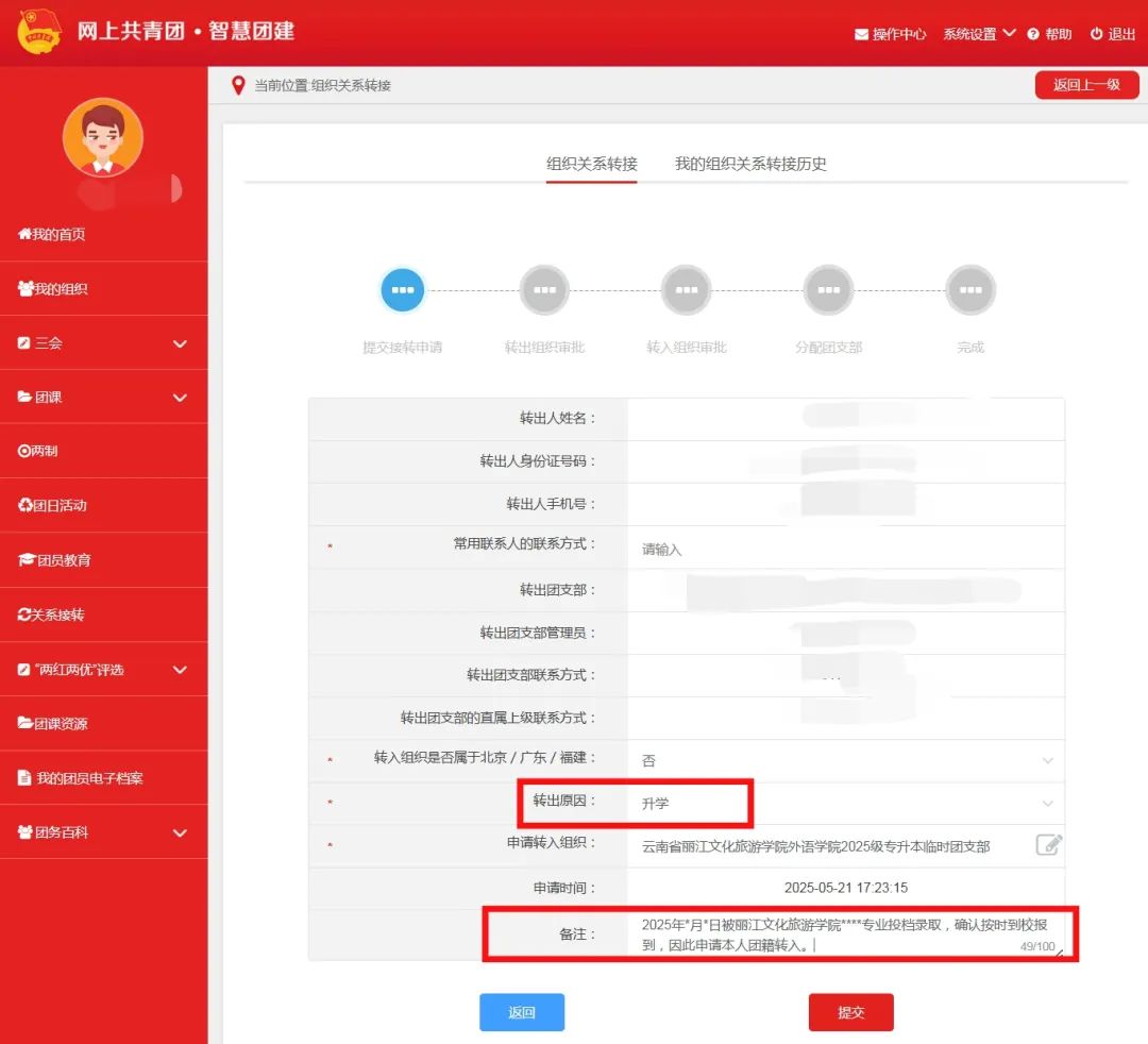 備注寫明:2025年*月*日被麗江文化旅游學(xué)院**學(xué)院***專業(yè)投檔錄取,確認(rèn)按時(shí)到校報(bào)到,因此申請(qǐng)本人團(tuán)籍轉(zhuǎn)入。