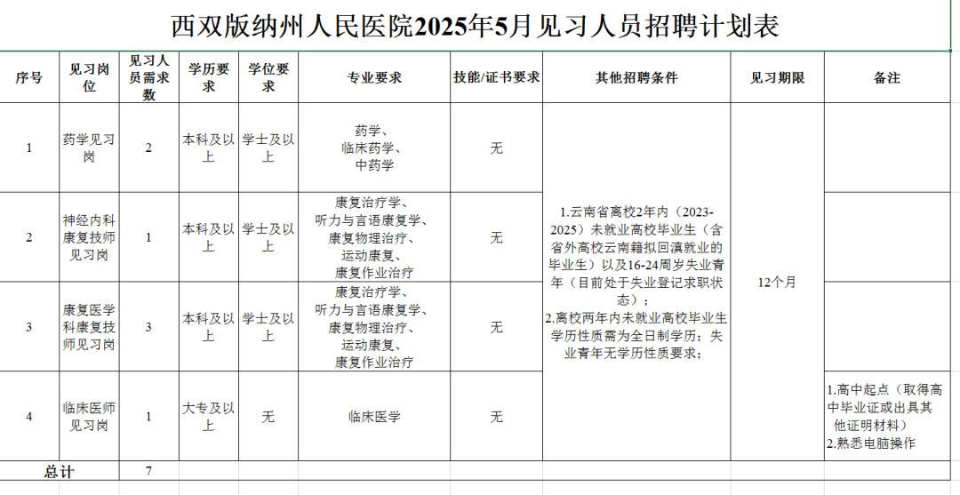 詳見《西雙版納州人民醫(yī)院2025年5月見習人員招聘計劃表》(附件1)。