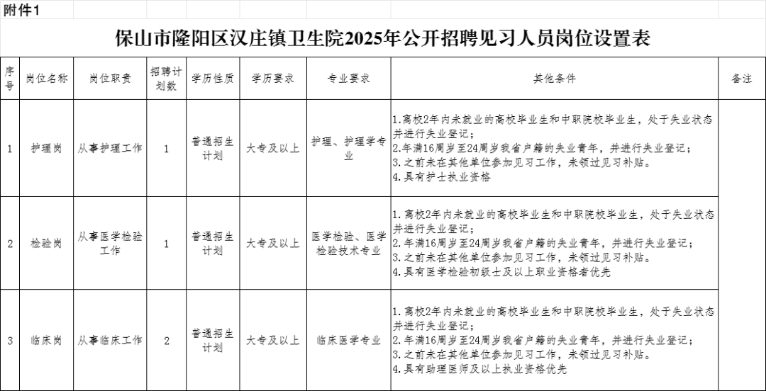附件:附件1.隆陽(yáng)區(qū)漢莊鎮(zhèn)衛(wèi)生院2025年公開(kāi)招聘見(jiàn)習(xí)人員崗位設(shè)置表.xlsx