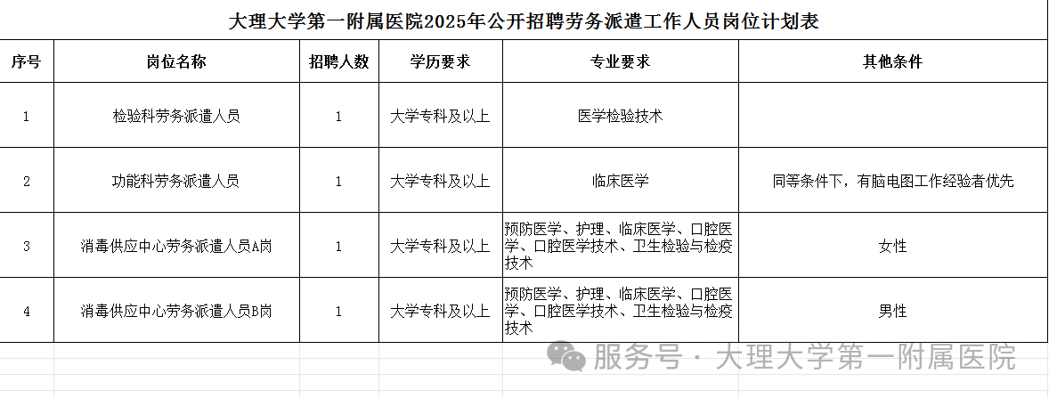 根據(jù)2025年用人計(jì)劃,大理大學(xué)第一附屬醫(yī)院面向社會(huì)公開(kāi)招聘勞務(wù)派遣工作人員4名,現(xiàn)將具體事宜公告如下:
