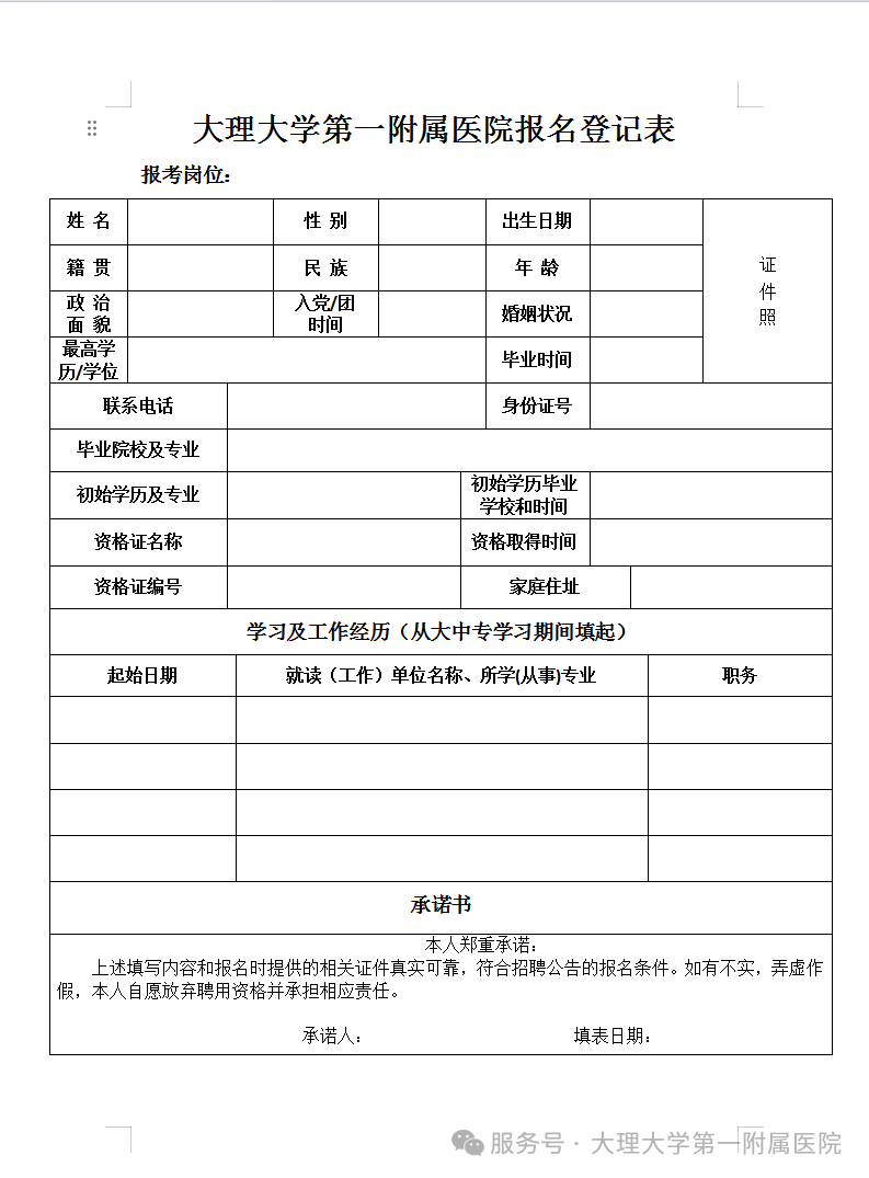 3.報(bào)名地點(diǎn):大理大學(xué)第一附屬醫(yī)院醫(yī)技樓7樓人事科