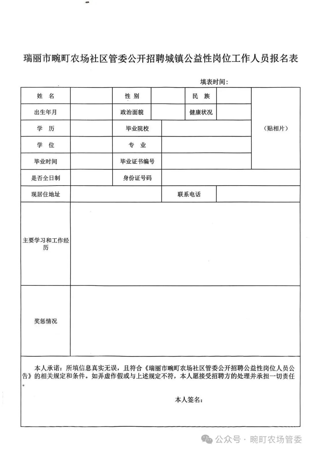 附件:《瑞麗市畹町農(nóng)場社區(qū)管委招聘公益性崗位工作人員報名表》