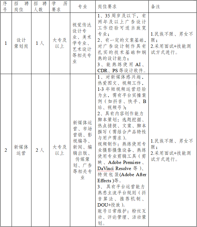 澄江市文化旅游投資開發(fā)有限責(zé)任公司數(shù)字傳媒分公司致力于服務(wù)澄江傳媒和文化產(chǎn)業(yè)發(fā)展,主要業(yè)務(wù)有影視制作、新媒體平臺(tái)運(yùn)營(yíng)、戶外廣告位經(jīng)營(yíng)、廣告物料設(shè)計(jì)制作、文化傳播、活動(dòng)策劃等。為提高公司業(yè)務(wù)經(jīng)營(yíng)能力,加強(qiáng)國(guó)有企業(yè)人才隊(duì)伍建設(shè),結(jié)合公司發(fā)展及相關(guān)計(jì)劃安排,擬面向社會(huì)公開招聘工作人員3名。現(xiàn)將有關(guān)事項(xiàng)公告如下: