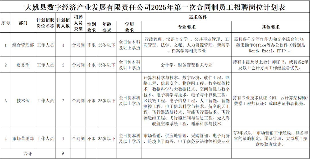 大姚縣數(shù)字經(jīng)濟(jì)產(chǎn)業(yè)發(fā)展有限責(zé)任公司2025年度(第一次)計(jì)劃招聘合同制員工6名,具體招聘崗位、人數(shù)及招聘條件要求如下: