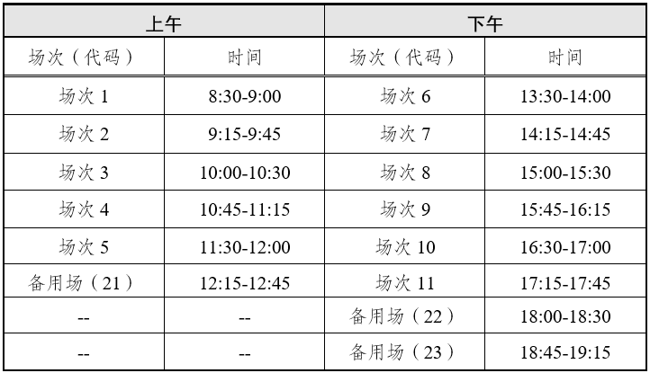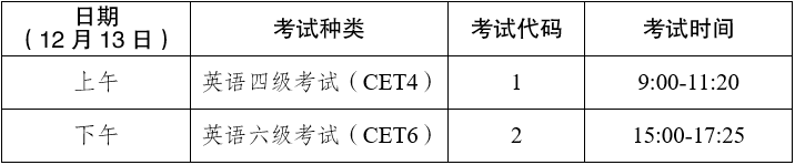 英語四級口語考試(CET-SET4)時間為11月22日(F253次),英語六級口語考試(CET-SET6)時間為11月23日(S254次),具體場次安排如下: