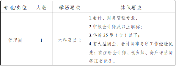 本次招聘財務管理崗人員1名。崗位設置及具體要求見下表。