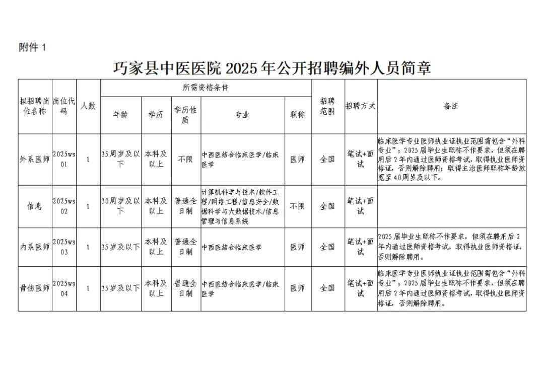 附件:1.巧家縣中醫(yī)醫(yī)院2025年公開招聘編外人員簡章