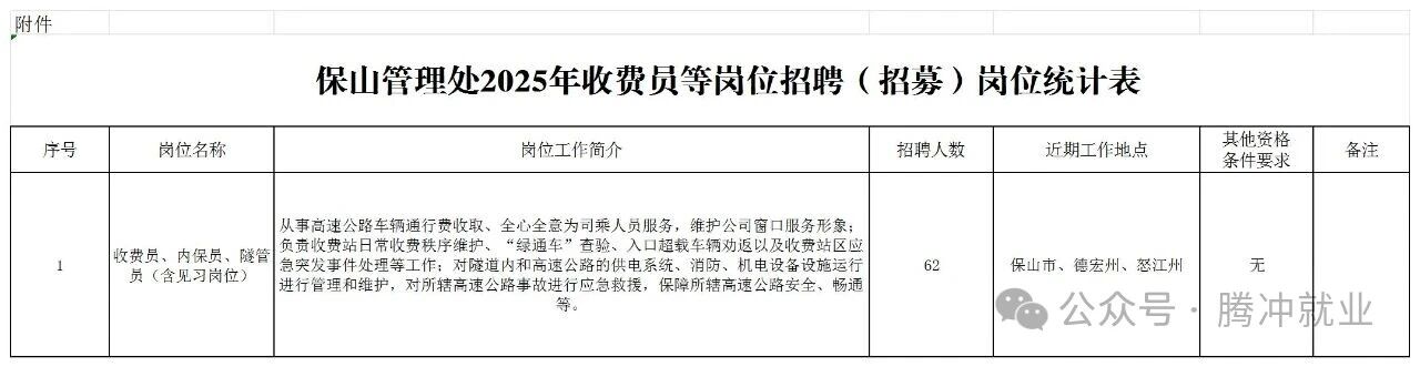 附件:保山管理處2025年收費員等崗位招聘(招募)崗位統(tǒng)計表