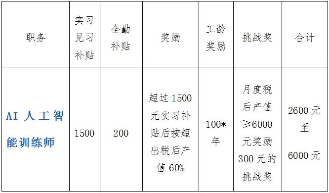 綜合薪資: 2600元-6000 元,實習見習補貼1500元+全勤補貼200元+績效獎勵(超過1500元實習補貼后按超出稅后產(chǎn)值的60%計提)+工齡獎勵100元/年+月度挑戰(zhàn)獎300元,轉正后簽訂正式勞動合同,購買社保。