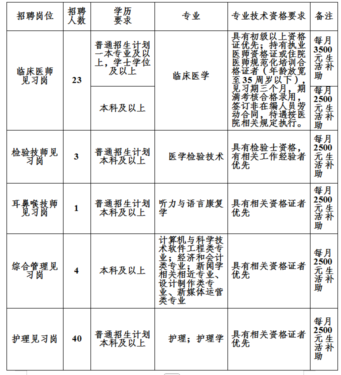 (二)見習期間給予相應生活補助費,臨床醫(yī)師見習崗(一本)每人每月不低于3500元;臨床醫(yī)師見習崗(本科)、醫(yī)技和管理類見習崗、護理見習崗每人每月不低于2500元。