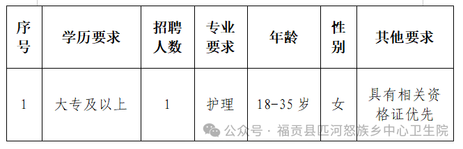 為進(jìn)一步加強(qiáng)福貢縣匹河怒族鄉(xiāng)中心衛(wèi)生院專業(yè)技術(shù)人才隊(duì)伍建設(shè),滿足醫(yī)院業(yè)務(wù)發(fā)展需要,提高服務(wù)能力,促進(jìn)醫(yī)院可持續(xù)發(fā)展。現(xiàn)面向社會(huì)公開(kāi)招聘編外人員 1 名。有關(guān)招聘事宜公告如下: