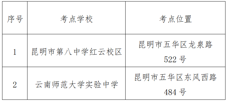 五華區(qū)共設2個考點??忌筛鶕?jù)準考證信息確認自己的考點,避免找錯考點、進錯考場。考點具體地址如下:重點提醒: