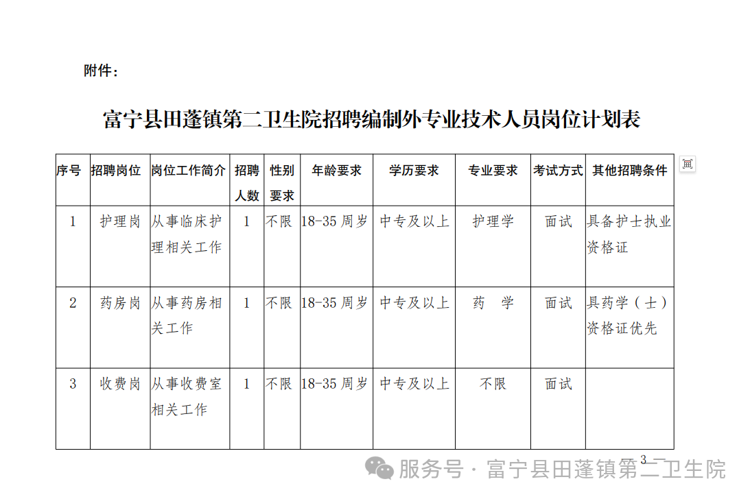 此次招聘編制外工作人員3名,具體崗位、人數(shù)、資格條件等詳見附件《富寧縣田蓬鎮(zhèn)第二衛(wèi)生院招聘編制外專業(yè)技術(shù)人員崗位計(jì)劃表》。