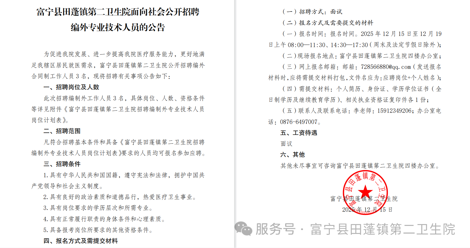 為促進(jìn)我院發(fā)展、進(jìn)一步提高我院醫(yī)療服務(wù)能力,更好地滿足我轄區(qū)居民就醫(yī)需求,富寧縣田蓬鎮(zhèn)第二衛(wèi)生院公開招聘編外合同制工作人員3名,現(xiàn)將招聘有關(guān)事項(xiàng)公告如下: