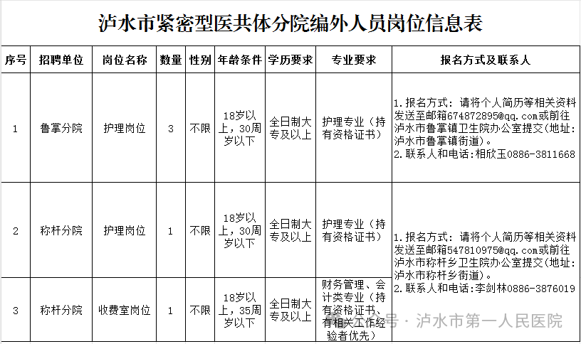分院現場/線上報名:詳見《瀘水市緊密型醫(yī)共體2026年編外人員招聘崗位信息表》。
