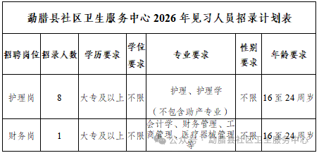 勐臘縣社區(qū)衛(wèi)生服務(wù)中心關(guān)于2026年招聘見習崗工作人員公告