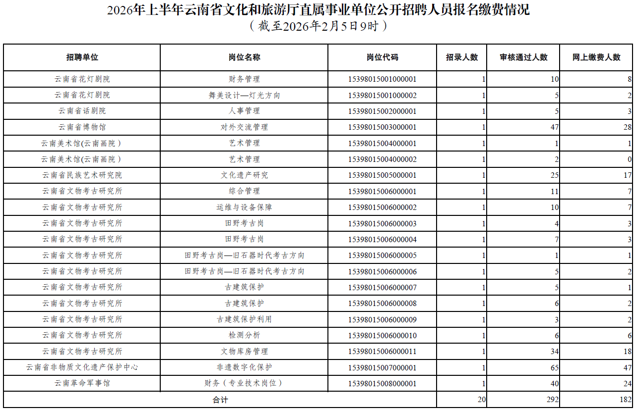 2026年上半年云南省文化和旅游廳直屬事業(yè)單位公開招聘人員報(bào)名繳費(fèi)情況