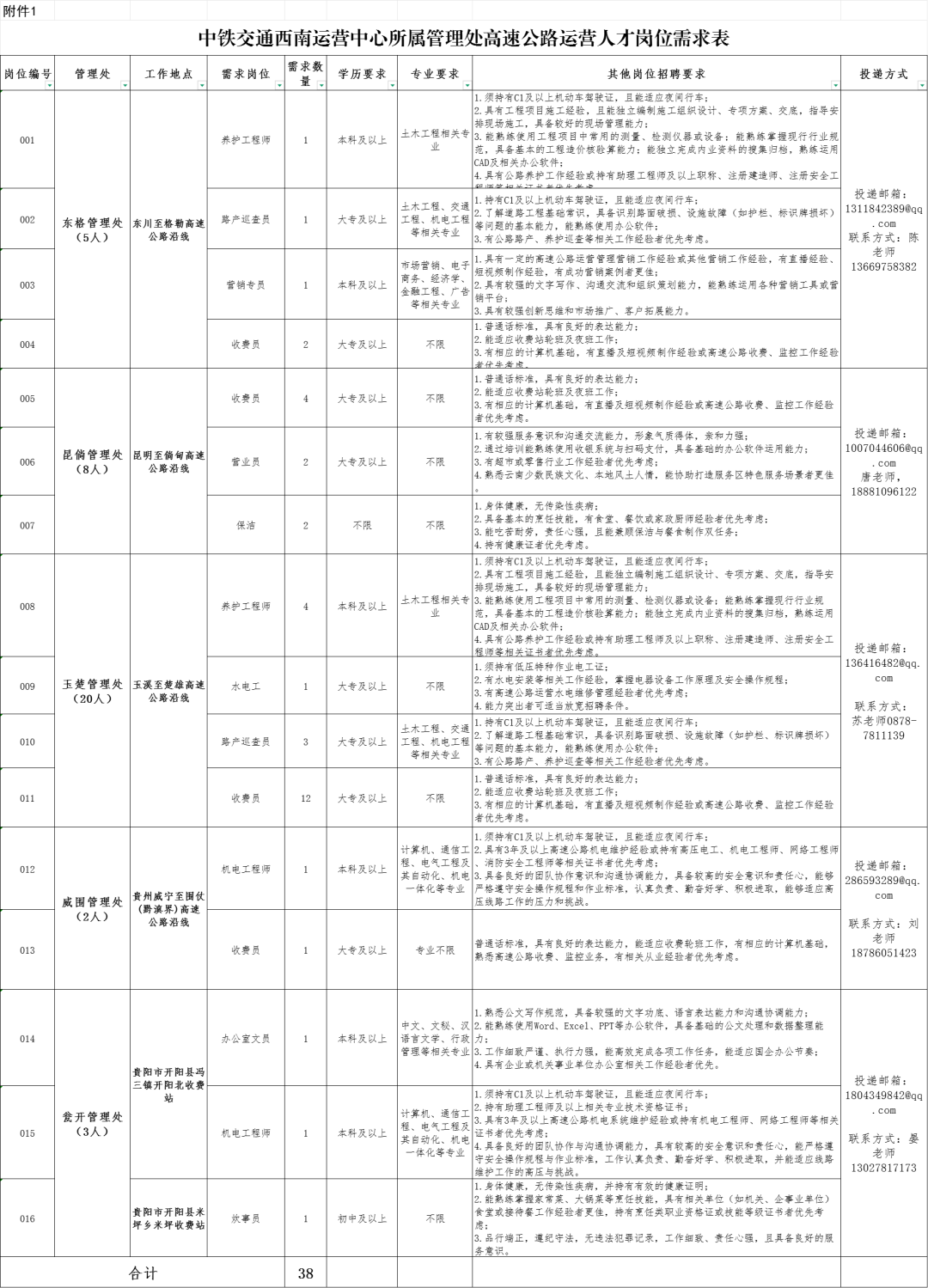 詳見附件1(中鐵交通西南運(yùn)營中心所屬管理處高速公路運(yùn)營人才崗位需求表)