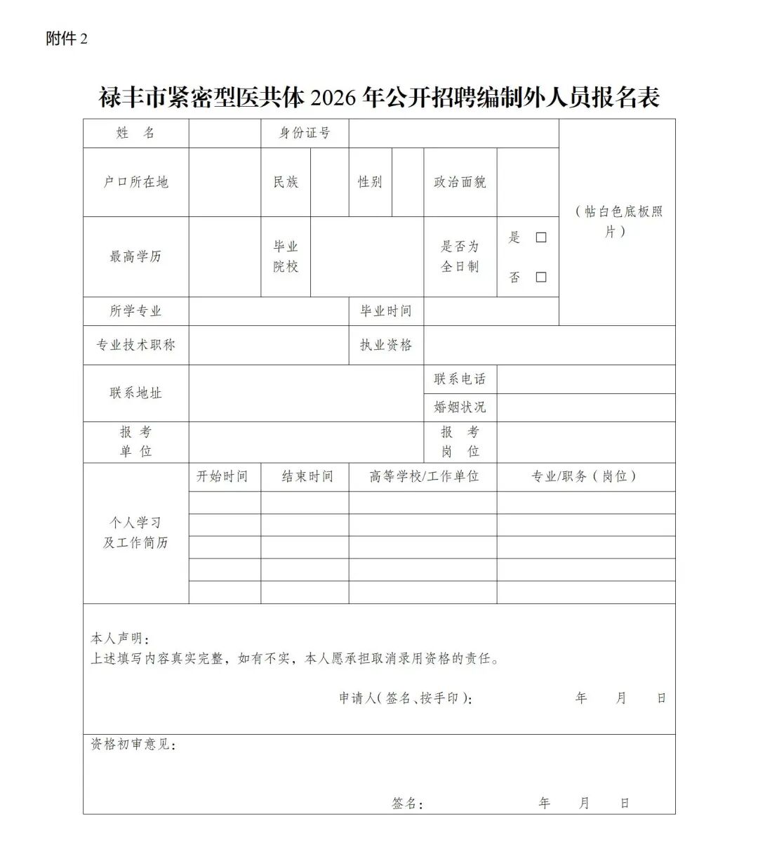 2. 祿豐市緊密型醫(yī)共體2026年公開(kāi)招聘編制外工作人員報(bào)名表
