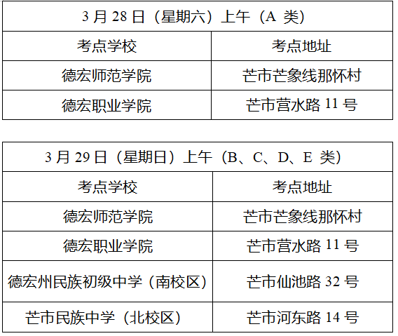 (四)根據(jù)氣象部門預(yù)測,芒市3月28日晴(13/27℃)、3月29日小雨(13/24℃)。請密切關(guān)注近期天氣變化情況,以免影響考試。