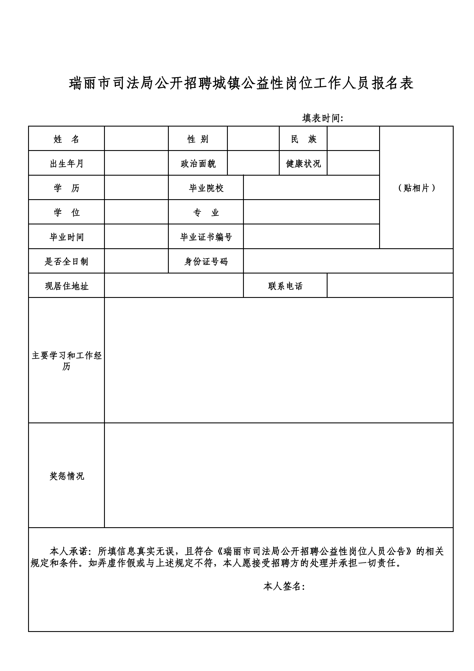 附件:瑞麗市司法局公開招聘城鎮(zhèn)公益性崗位工作人員報(bào)名表。