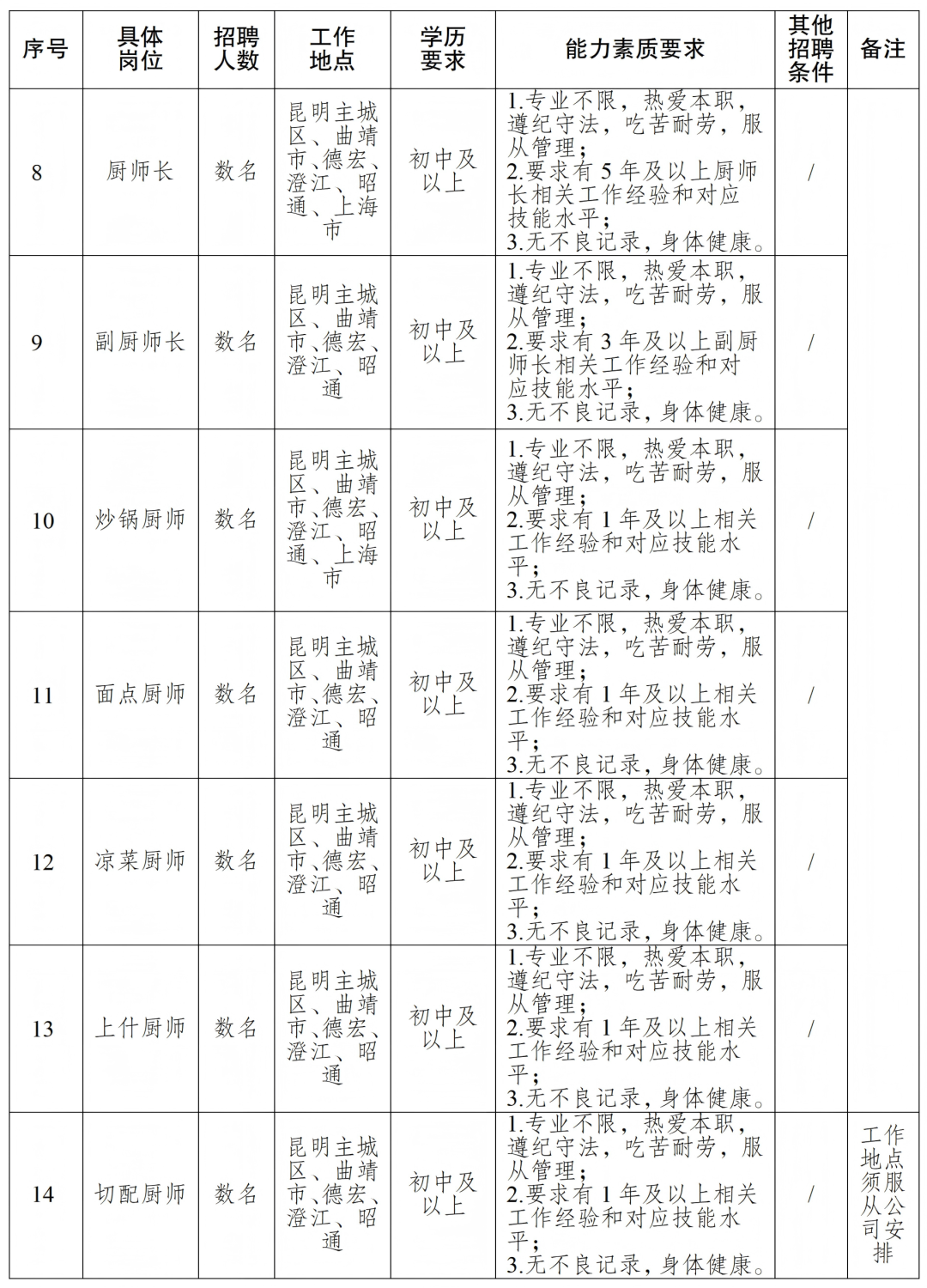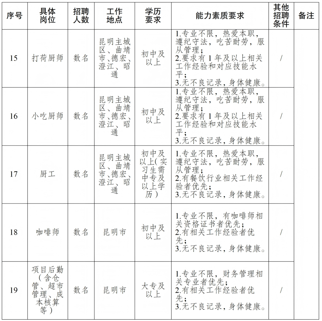 具體詳見《附件:云南云勤餐飲管理有限責(zé)任公司2026年度人員招聘崗位需求表》(附件1)
