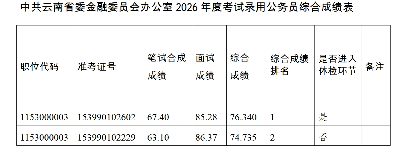 綜合成績(jī)按照筆試合成成績(jī)、面試成績(jī)各占50%的比例合成,筆試合成成績(jī)、面試成績(jī)四舍五入后均保留至小數(shù)點(diǎn)后2位,綜合成績(jī)四舍五入后保留至小數(shù)點(diǎn)后3位。詳見(jiàn)附件《中共云南省委金融委員會(huì)辦公室2026年度考試錄用公務(wù)員綜合成績(jī)表》。