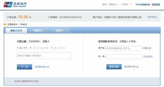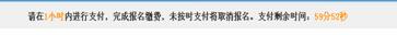 第二步:信息無誤后,點(diǎn)擊上圖中“在線支付”按鈕,進(jìn)行網(wǎng)上繳費(fèi)(網(wǎng)上支付的時限為網(wǎng)上報(bào)名后1個小時內(nèi),超時系統(tǒng)自動取消訂單,考生本次報(bào)名無效)。在線支付目前只支持銀聯(lián)支付方式。