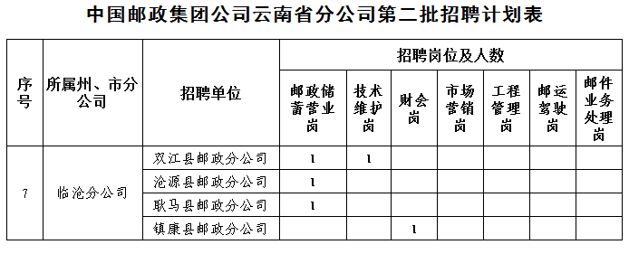 云南省分公司所屬州、市、縣分公司面向社會招聘以下崗位:1、金融業(yè)務(wù)崗175人;2、技術(shù)維護(hù)崗17人;3、財會崗13人;4、市場營銷崗8人;5、工程管理崗2人;6、郵運駕駛崗6人;7、郵件業(yè)務(wù)處理崗5人。
