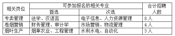 專賣管理崗位8人、卷煙營(yíng)銷崗位4人、煙葉生產(chǎn)崗位3人,合計(jì)招聘15人。