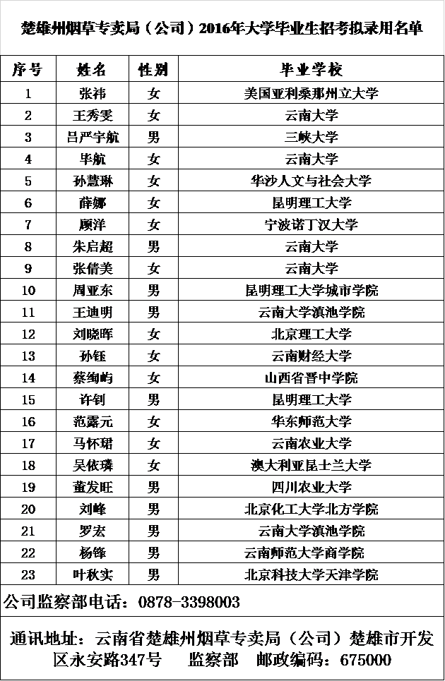 云南省煙草公司楚雄州公司2016年招考擬錄用人員名單