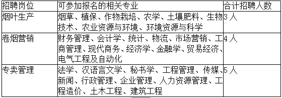 煙葉生產(chǎn)崗位3人、卷煙營(yíng)銷崗位4人、專賣管理崗位5人,合計(jì)招聘12人。